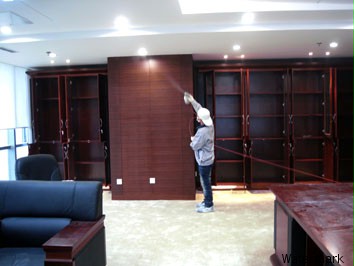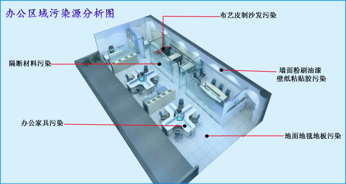 窗帘、地板等污染源的表面,并对整个空间进行喷涂。另外,对于办公地毯及家具,根据情况需要